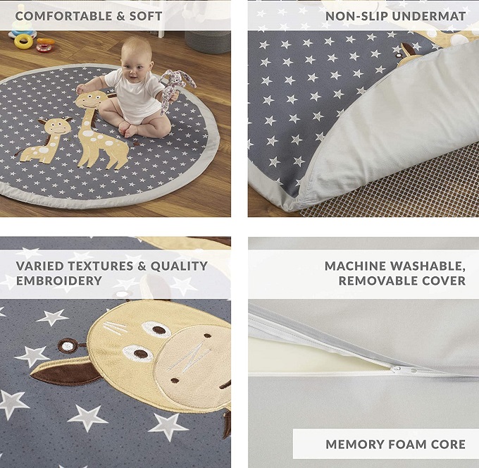 Play it safe Includes a non-clip mat, Recommended for hard flooring | Machine Washable Easy removable cover. Just Unzip, remove the cover and place in the washing machine | Sensory Fabrics Detailed with a large Mum and baby giraffe plush Applique, soft and cute |